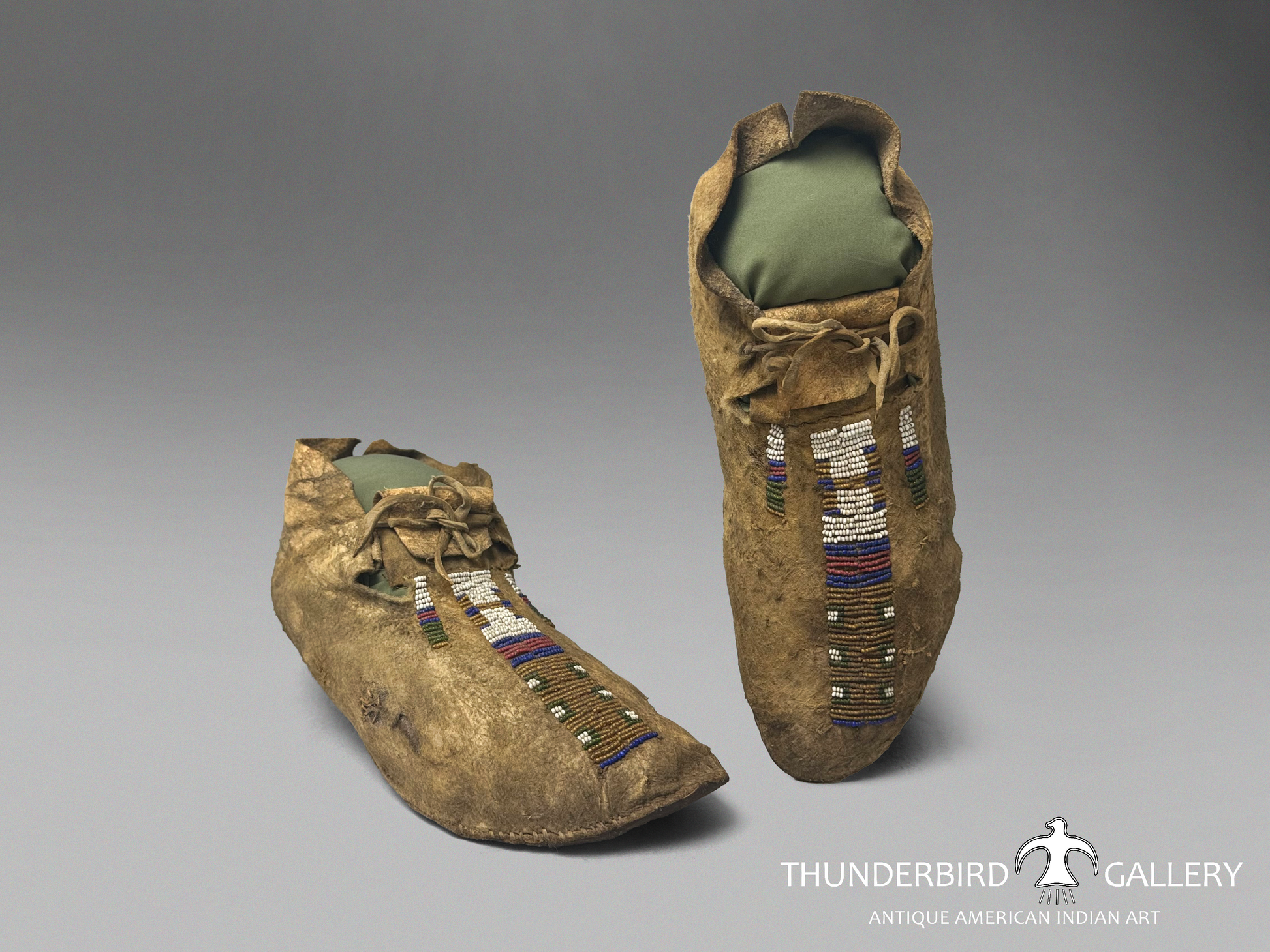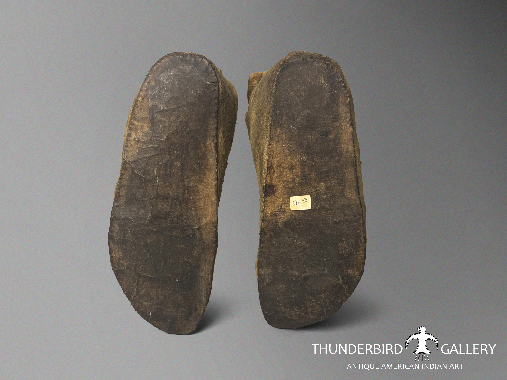 A pair of hard-soled moccasins constructed from native tanned hide. The vamps consist of a central column, with alternating rows of white, translucent orange, blue, red "white heart", and translucent green seed beads. Two smaller columns flank the vamp. A small price tag reading "50.00" is adhered to the soles. Accompanying the moccasins is a wall mount.